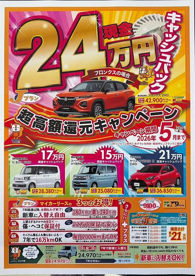 最大 24万円の現金還元で、月々の負担を抑えながら新車に乗れるチャンスです。