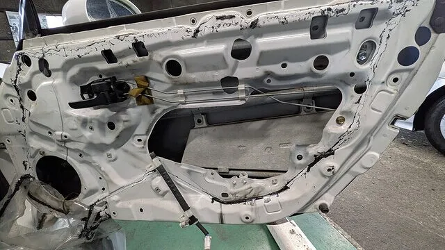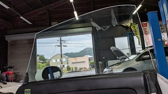 画像は作業中の様子ですが、普段見えない運転席窓ガラスの内部構造を