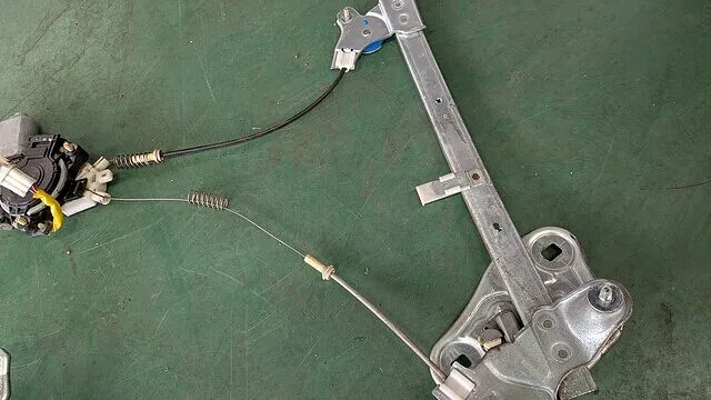 工場の作業台に並ぶ窓ガラスレギュレーター。