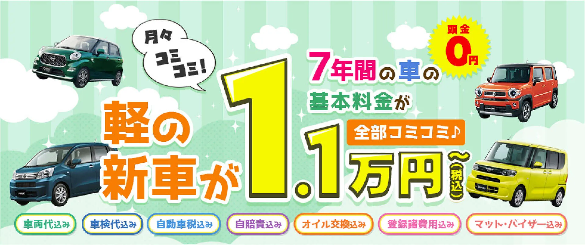 7年間ずっと月々11,000円~の低価格で新車に乗ることが可能!ローンと違ってまとまったお金も不要で、