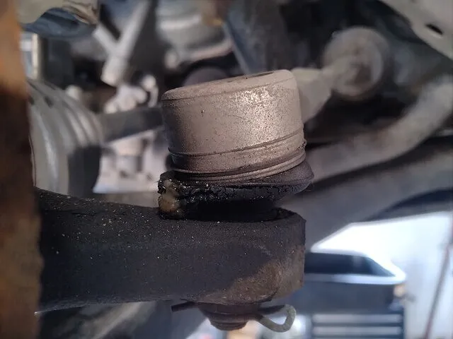 あと車検での発見は良くあるブーツ類、今回はかじ取り装置の一部タイロッドエンドブーツです。ゴム部品なので経年劣化により固くなり亀裂が入り最後は写真のように裂けてクリーム状のグリスが出てきます。この様な状態だと車検は通りませんので交換させていただきました。